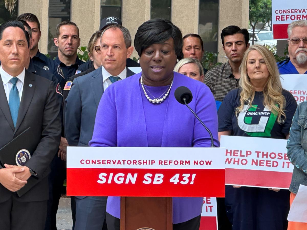 “We need new and concrete solutions to help those who suffer from serious mental health challenges, and SB 43 can make a difference,” said Nikky Avey, a member of the United Nurses Association of California who spoke at the rally.