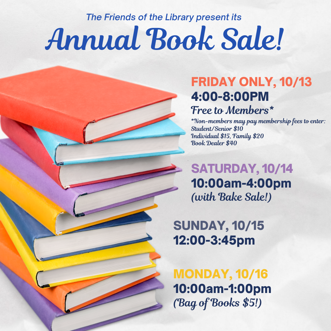 The Friends of the Library's Annual Book Sale is starting next week! Make sure to set your calendars for the event at the John C. Hart Library in Yorktown! | |