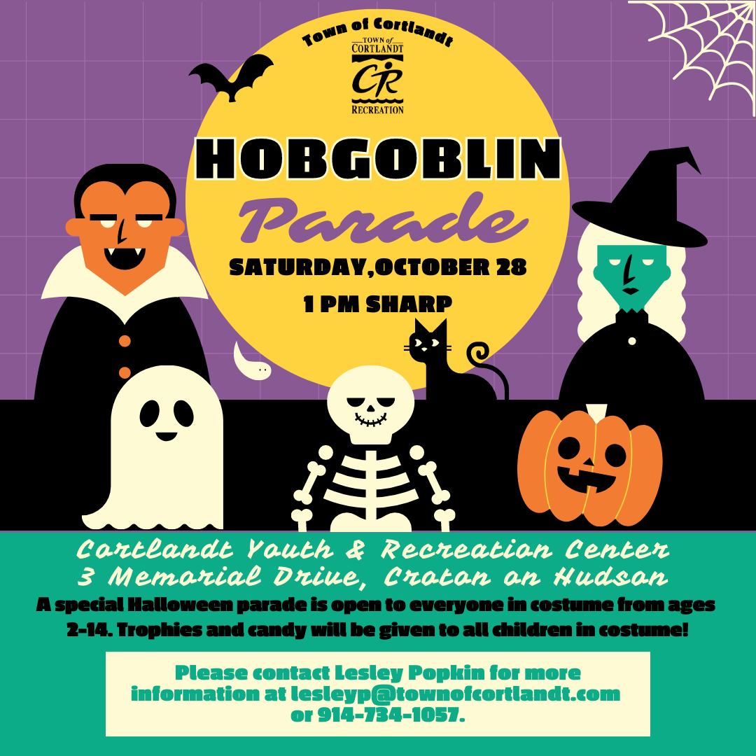 Halloween is on the way! The Town of Cortlandt Recreation Department has organized spook-tacular Halloween activities for our community! Check out the Hobgoblin Parade video happening on Saturday, October 28 at 1:00PM at our Cortlandt Youth & Recreation Center! Please contact the Town of Cortlandt Recreation Department for any questions or concerns at tocrec@townofcortlandt.com or 914-734-1050. | |