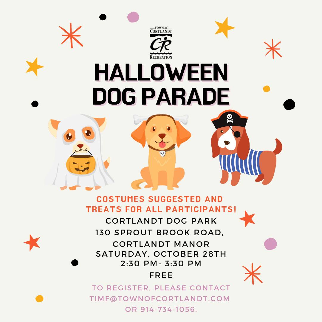 Join us at the Town of Cortlandt Halloween Dog Parade at the Cortlandt Dog Park located in Sprout Brook Park at 130 Sprout Brook Road in Cortlandt Manor on Saturday, October 28th at 2:30 PM!