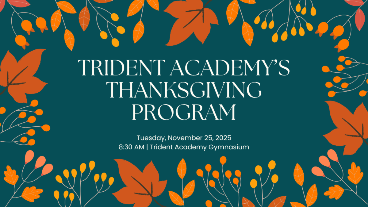 Thanksgiving Program on Tuesday Trident Academy families, you're invited to our Thanksgiving Program on Tuesday, November 25 at 8:30 a.m.! Our talented students have been perfecting their performances, and they are eager to share their hard work with everyone. Following the program, we'll gather in the courtyard for some refreshments.