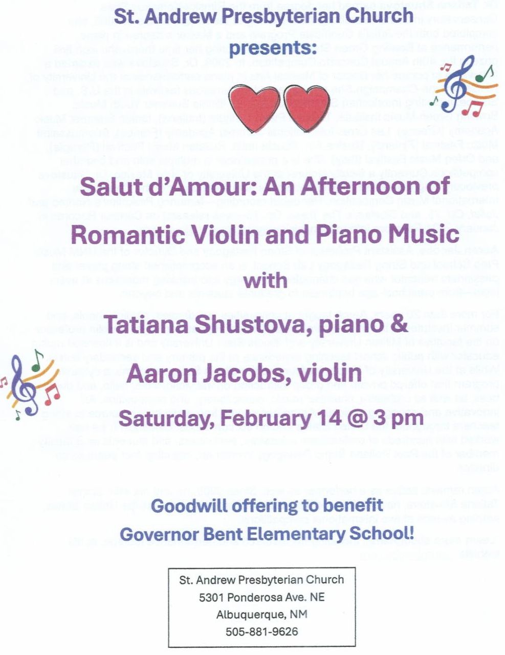 We want to invite your congregation to a recital at St. Andrew by their accompanist and her husband on February 14, at 3 pm. The concert is free and open to the public. There will be a goodwill offering to benefit Governor Bent Elementary School.