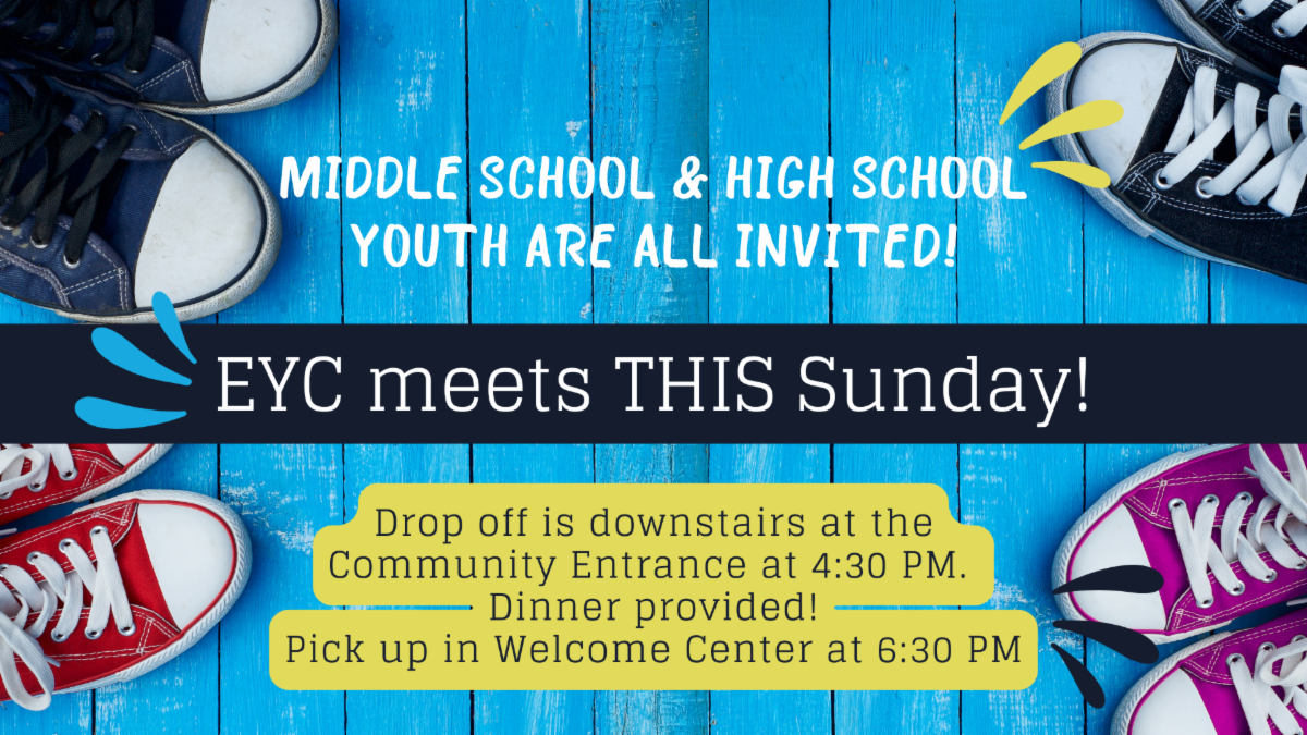 EYC Youth (both Middle and High School) regularly meet at 4:30-6:30 PM on Sundays in the Community & EYC rooms. Drop off is downstairs at the Community Entrance. Pick up is upstairs in the Welcome Center. Questions? Contact Tiffany Fulton, Director of Youth and Family Ministry