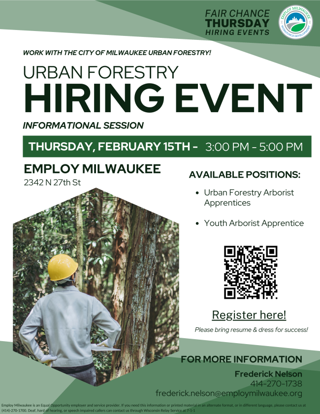 Richards Street WCC location: Thursday, February 15, 2024, from 1:00pm to 3:00pm- Milwaukee Community Service Corps will be onsite to offer information about PAID Training Opportunities for those who may qualify. OSHA & Forklift training, HVAC mechanics and installers. Please join us to meet with a recruiter. For more information see: www.milwaukeecommunityservicecorps.org | | |