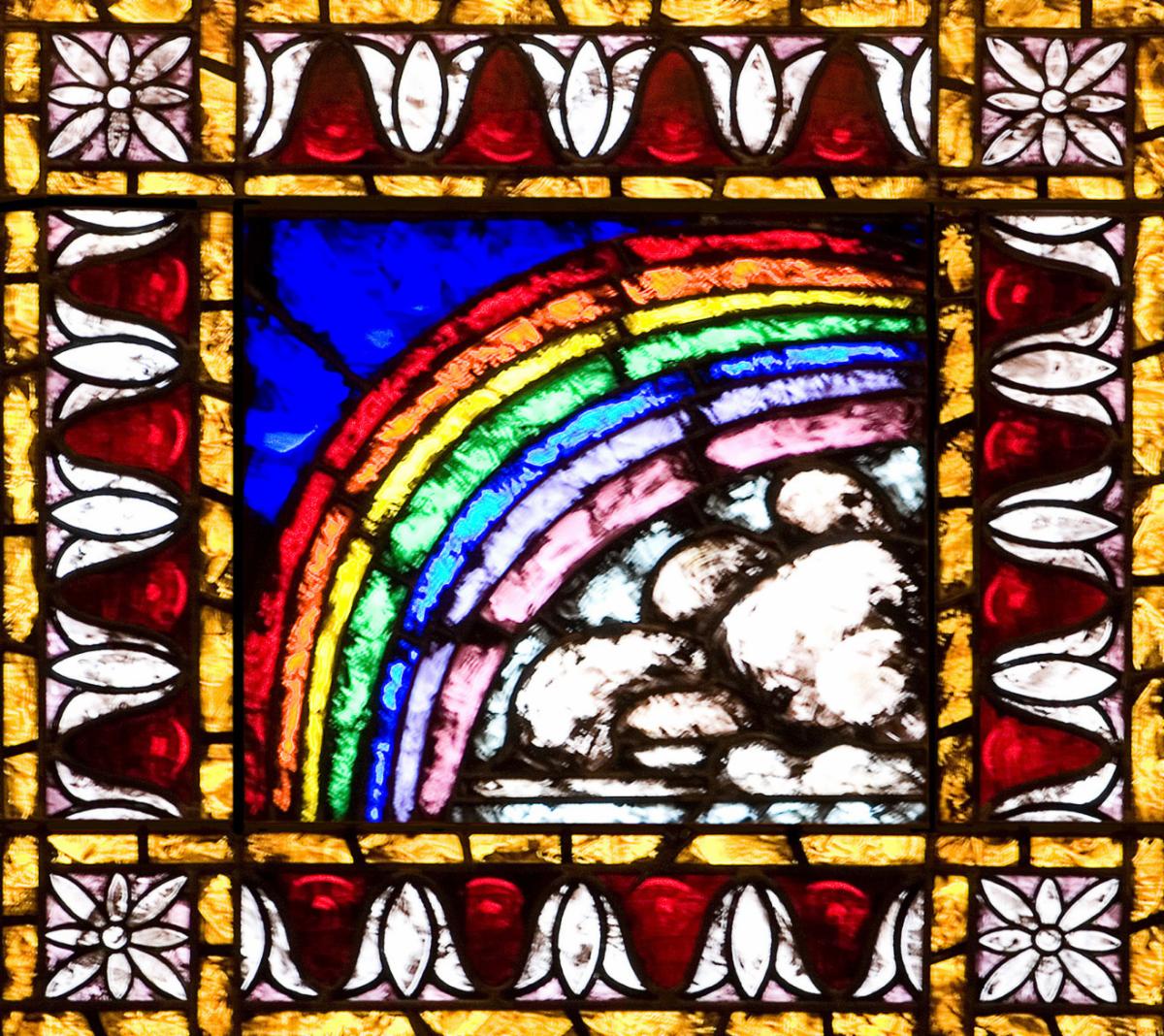 This rainbow stained glass is located on the east side of the Sanctuary, high on the north wall, second from the east.