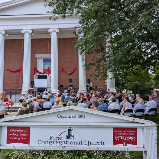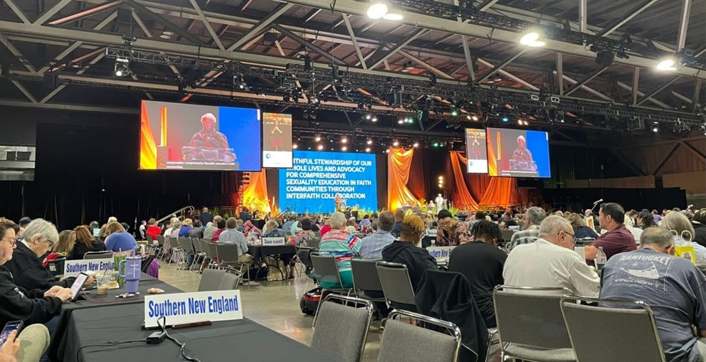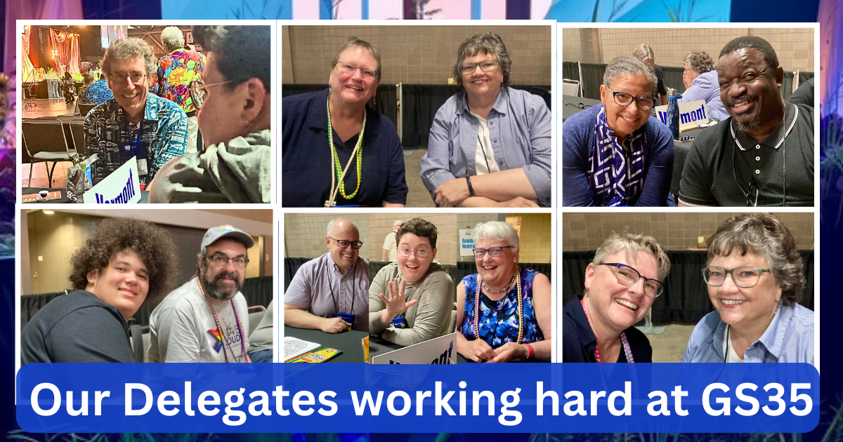 Your Vermont Delegation just returned this week from the UCC General Synod, held in Kansas City! Each of our delegates, (Rhonda Myers, Shawn Bracebridge, Cameron Matthews, Caryne Eskridge, Jane LoBrutto, Laura Engelken, Ezra Chapola, Dave Schilling, and Kim McKerley), gained so much from the week. We listened to our General Minister and President, Karen Georgia Thompson, preach on Sunday, and heard from many other wonderful musicians and speakers. We also voted on a number of resolutions. Each delegate was assigned to a committee where they worked on the wording of their resolution. The most hotly contested was the Declaration for an end to Genocide in Palestine. In the end, the Synod voted overwhelmingly to pass this resolution.