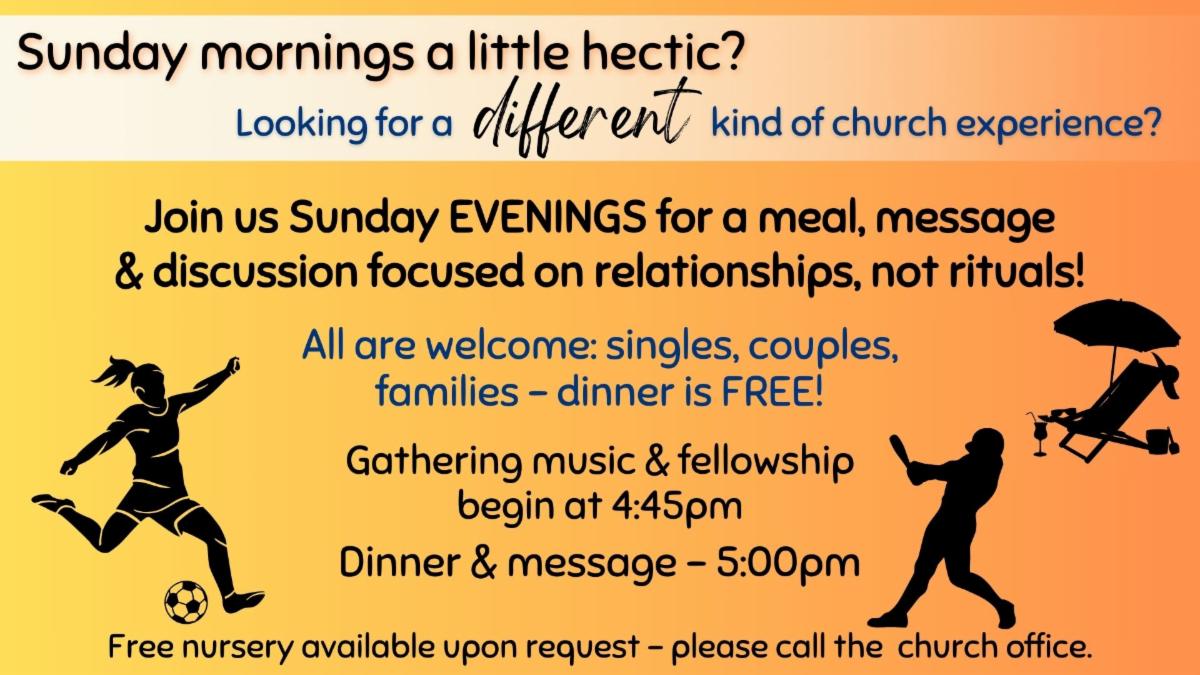 Gather dinner church worship is from 5:00 to 6:00 in the fellowship hall. Our middle school and high school youth along with their parents are invited to a thirty-minute informational meeting at 6:00 p.m. in the parlor to discuss the hopes, plans, and expectations for youth group this year. The youth will then stay from 6:30 to 7:30 for dinner and fellowship in room 102. All our ministry teams are so excited to be kicking off another program year together, and we can’t wait to welcome you this Sunday!