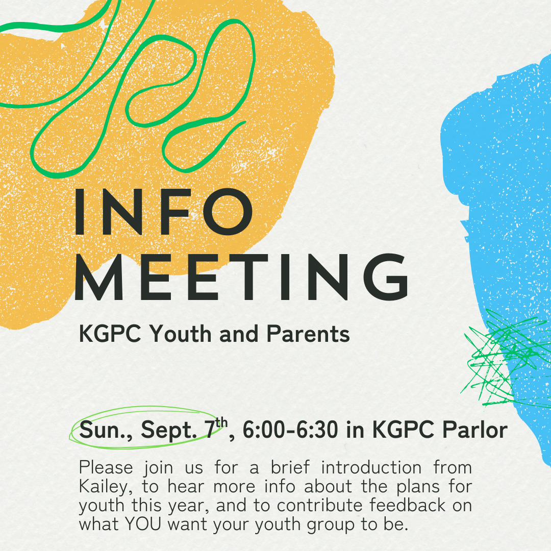 Welcome back KGPC, to a new season of refreshment and growth in the name of the Lord! Next week we will start the Handbell groups again, Music Makers for children will begin rehearsals on Sept. 14th to learn a new song for World Communion Sunday, and on Sept. 13th and 14th, our choir will have their annual Christmas Cantata Retreat, where they learn what our cantata will be and will start the deep dive into learning the music. I encourage you to start the year with us! Connect with me about joining a music group that serves God with love and allows you to use your musical gifts for His Glory.