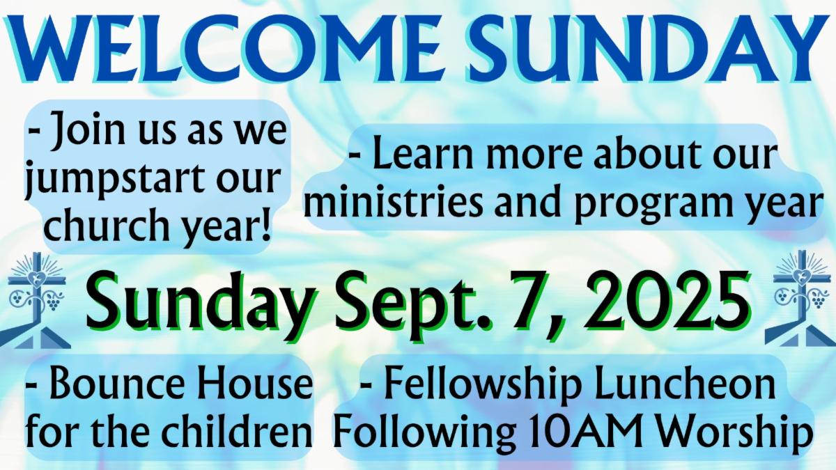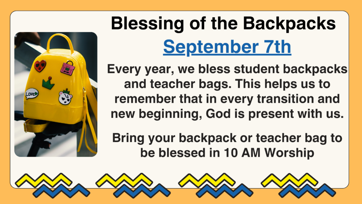 King’s Kids, our children’s faith formation opportunity, occurs during worship with Pre-K children in room 117 and kindergarten through fifth grade in room 104. The children will generally be dropped off at their rooms before worship begins, but THIS SUNDAY THE CHILDREN WILL BEGIN IN WORSHIP where we will be presenting third grade Bibles and blessing the backpacks of students, teachers, and education professionals. We encourage your elementary age children to begin in worship with you. If you have Pre-K children, you may choose to drop them off at room 117 before worship or have them with you in service for the blessing of the backpacks. All the children participating in King’s Kids will leave with their teachers after their backpacks have been blessed. The kindergarten through fifth grade children will be brought back to the sanctuary for communion near the end of the service. Pre-K children can be picked up at room 117 after service concludes. Nursery care is available for children 0 to 36 months from 8:30 to 11:30 in room 120. Following worship, we invite everyone to join us outside for the Welcome Sunday Fellowship Luncheon complete with a bouncy house for the young in age and young at heart.