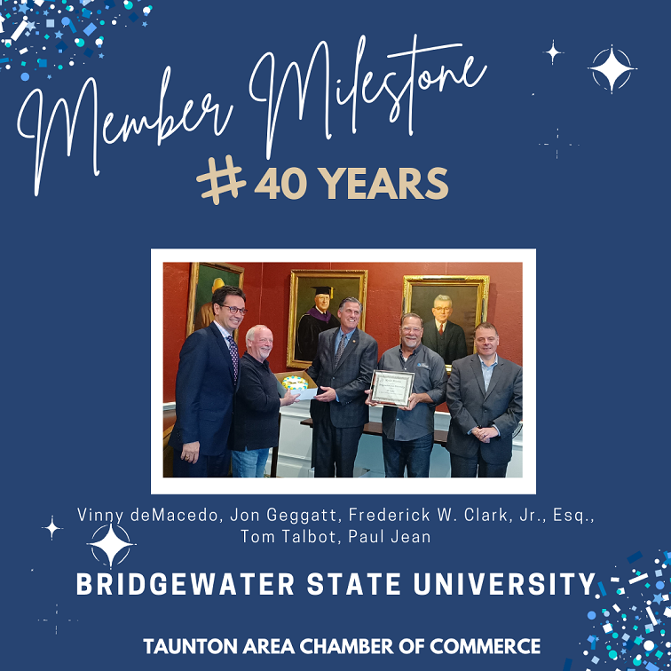 Wow 40 Years!! Congratulations and gratitude to our friends at Bridgewater State University celebrating 40 years as a member of the TACC! At a recent visit, our Chamber representatives Jon Geggatt, Tom Talbot and Lisa DeMelo received a very warm welcome from Director of Regional Partnerships Vinny deMacedo, President Frederick W. Clark, Jr., Esq. and Vice President of Marketing and Communications Paul Jean.