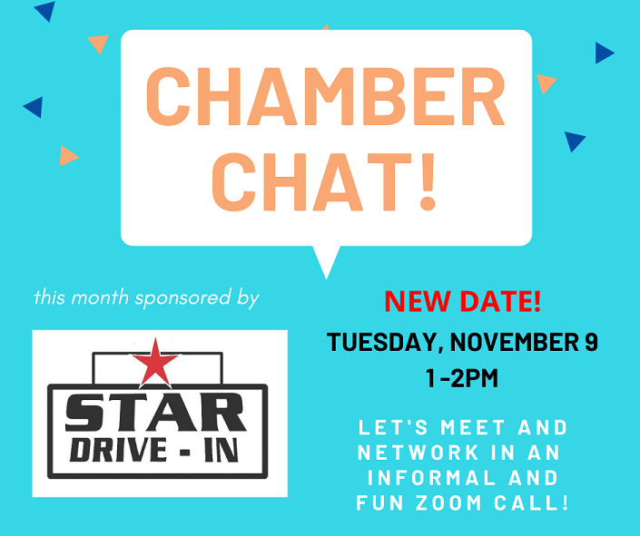 Join us for the next session of our Chamber Chat virtual networking series! Meet other members in this fun and informal setting with trivia and prizes! This session is Tuesday, November 9th at 1:00 p.m. and is sponsored by our newest member The Star Drive-In. Register below for this event.