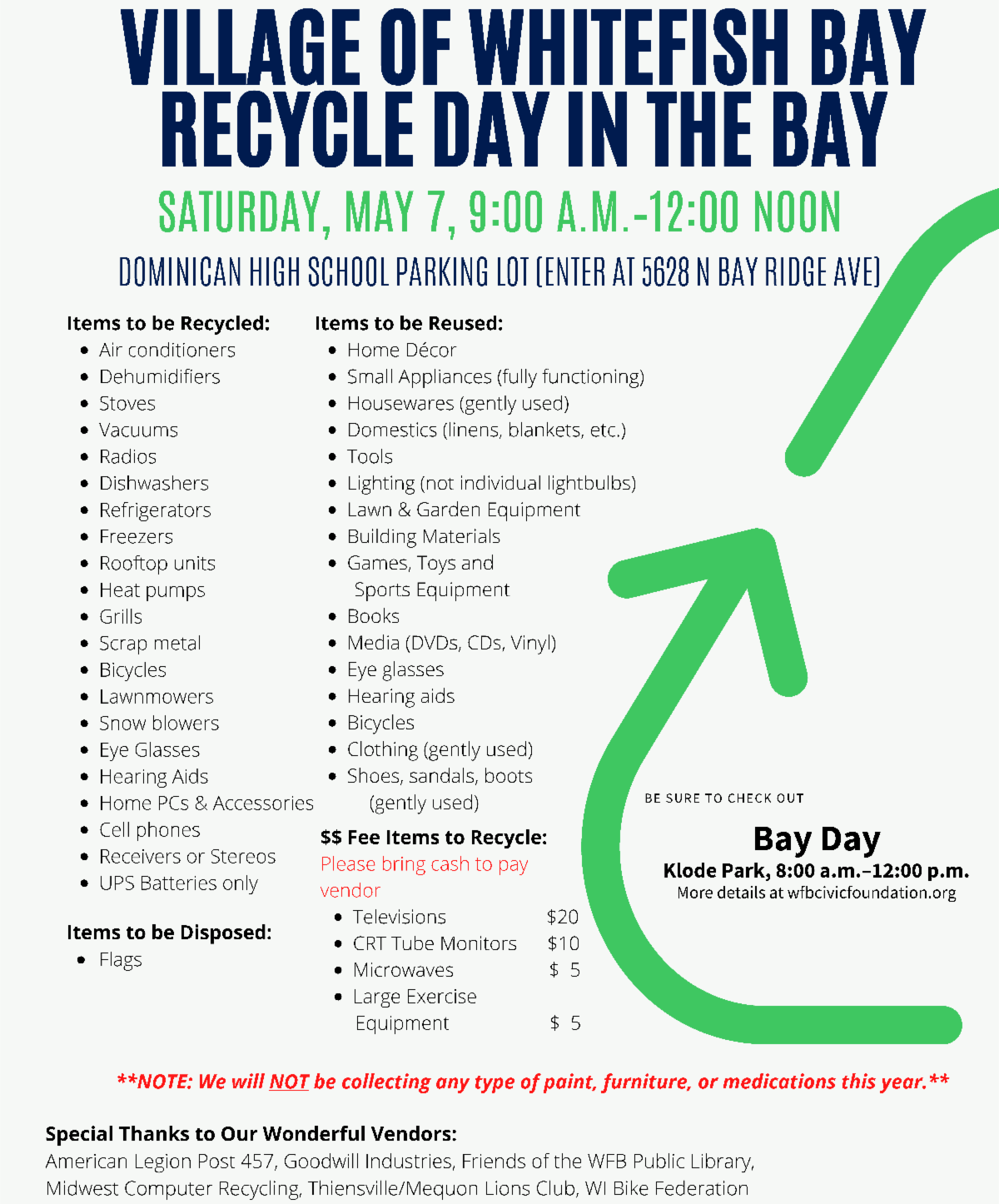 The annual Village recycling drop-off event returns after a two year hiatus on Saturday, May 7, 2022, from 9:00 a.m. to 12:00 Noon, in the Dominican High School parking lot (entrance on Bay Ridge), in conjunction with Bay Day.