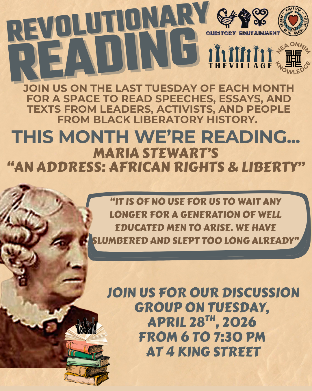 This month, we will be reading Maria Stewart's "An Address: African Rights & Liberty." This speech is delivered in 1833 at The African Masonic Hall in Boston, MA.
