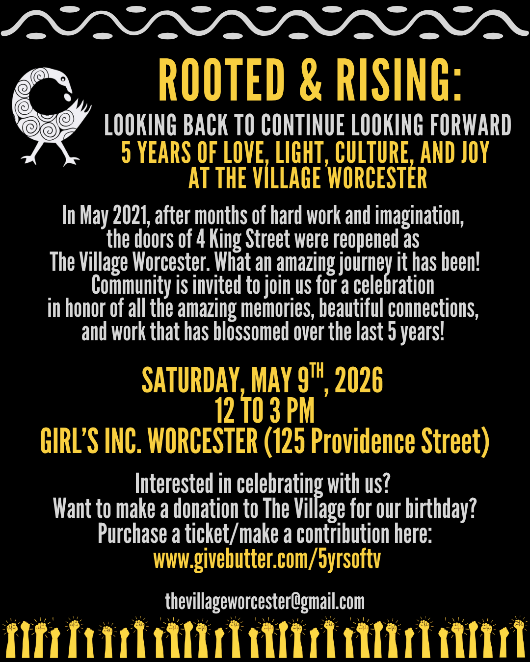 In May 2021, after months of hard work and imagination, the doors of 4 King Street were reopened as The Village Worcester. What an amazing journey it has been! Community is invited to join us for a celebration in honor of all the amazing memories, beautiful connections, and work that has blossomed over the last 5 years!