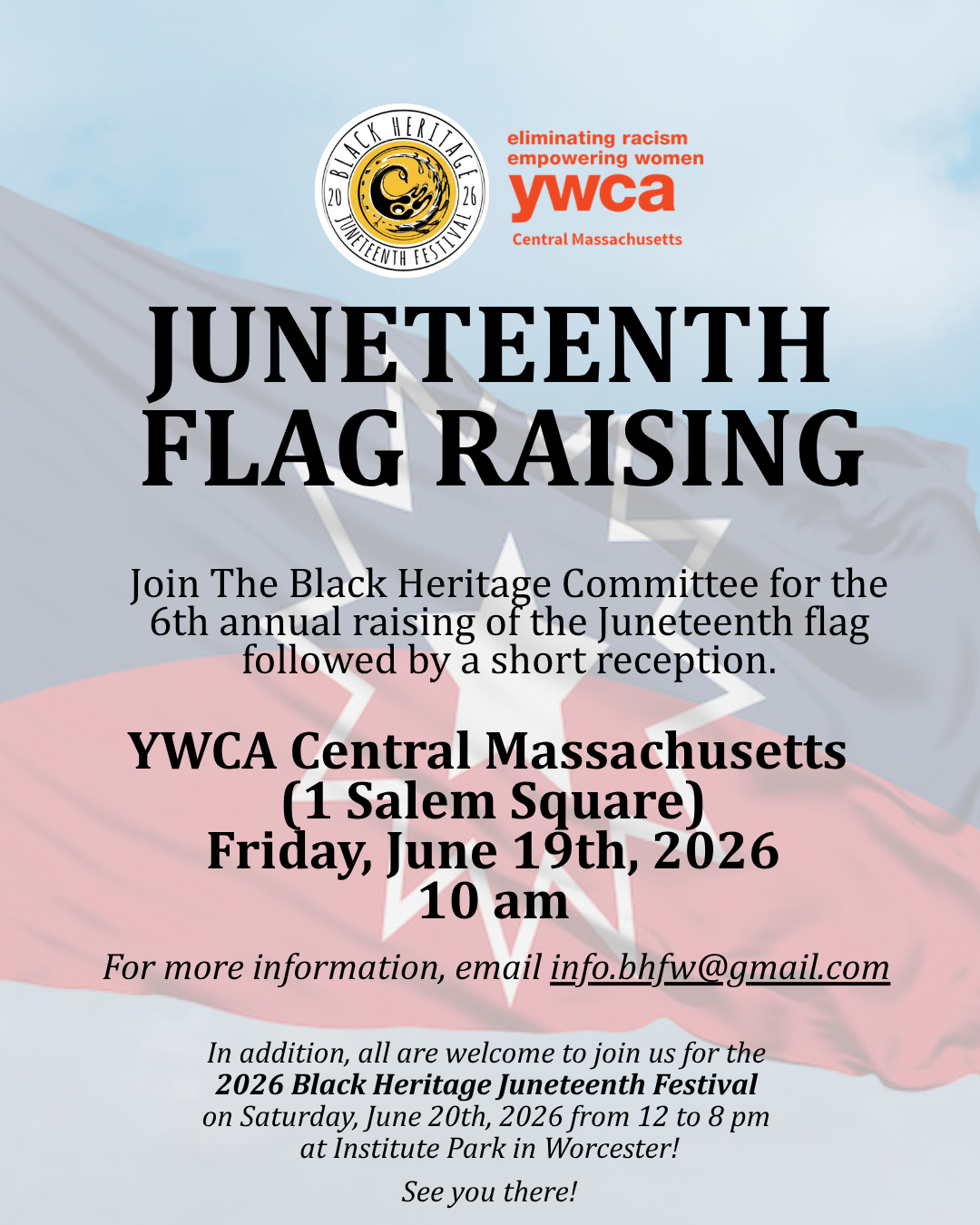 Join the Black Heritage Committee for the 6th Annual raising of the Juneteenth Flag at the YWCA of Central MA. We will reflect on Juneteenth's meaning and significance in the times we are living in - 161 years after the reading of General Order No. 3 that declared enslaved people in Galveston, TX were "free," and should have been two and a half years prior.