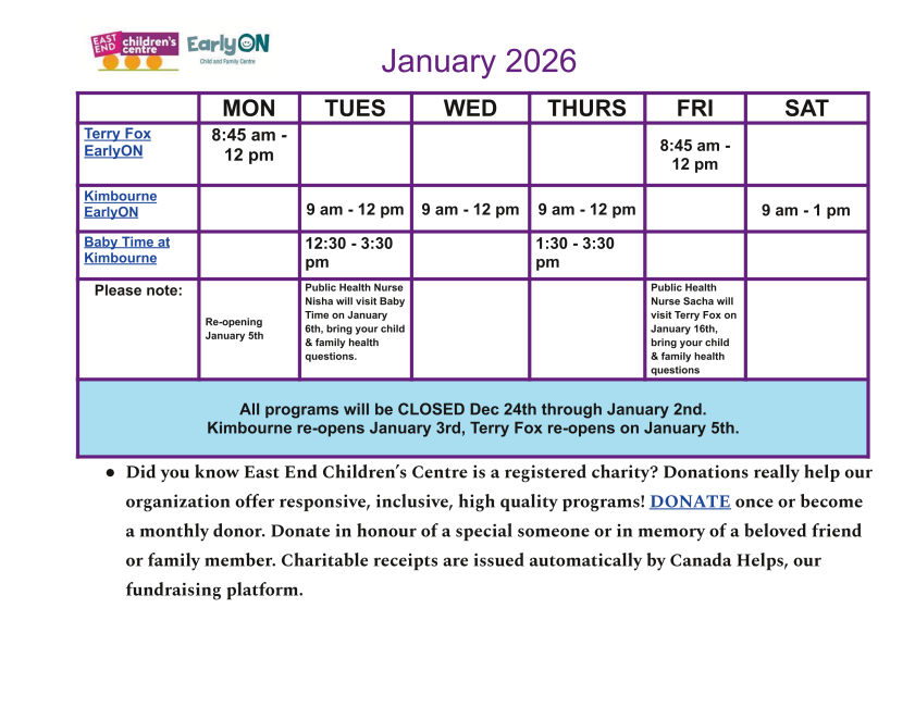 • we usually offer a nice snack to children during our morning programs. During ongoing kitchen renovations at our Kimbourne site, please bring your own NUT FREE snack. Snacks continue to be available at the Terry Fox EarlyON.