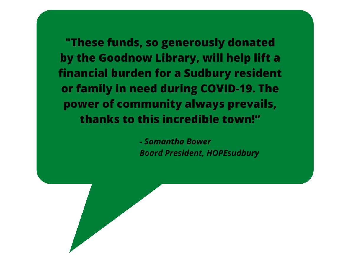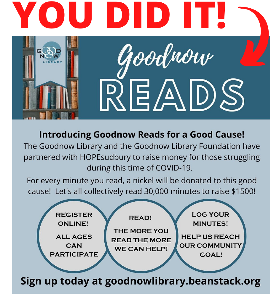 Last month, the GLF was thrilled to partner with the Library in order to raise funds to support HOPEsudbury’s efforts to help local residents during the coronavirus crisis. Our goal was for our community to collectively read 30,000 minutes to raise $1,500 for HOPEsudbury.