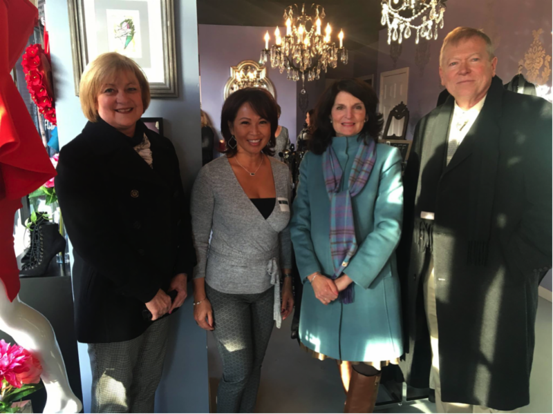 Village of Barrington Economic Development Director Peggy Blanchard, Village President Karen Darch, and Village Manager Jeff Lawler are pictured with FlutterFab owner Chi Farley (second from left).