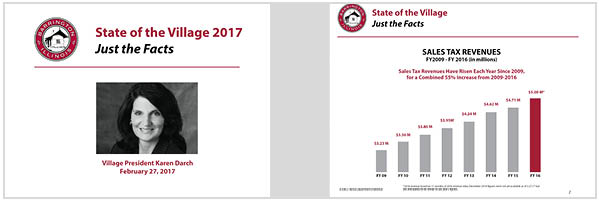 Village President Karen Darch gave her annual "State of the Village" speech at the most recent Board of Trustees meeting. Her speech outlined the facts about the Village finances, current economic development projects, infrastructure projects, and more.
