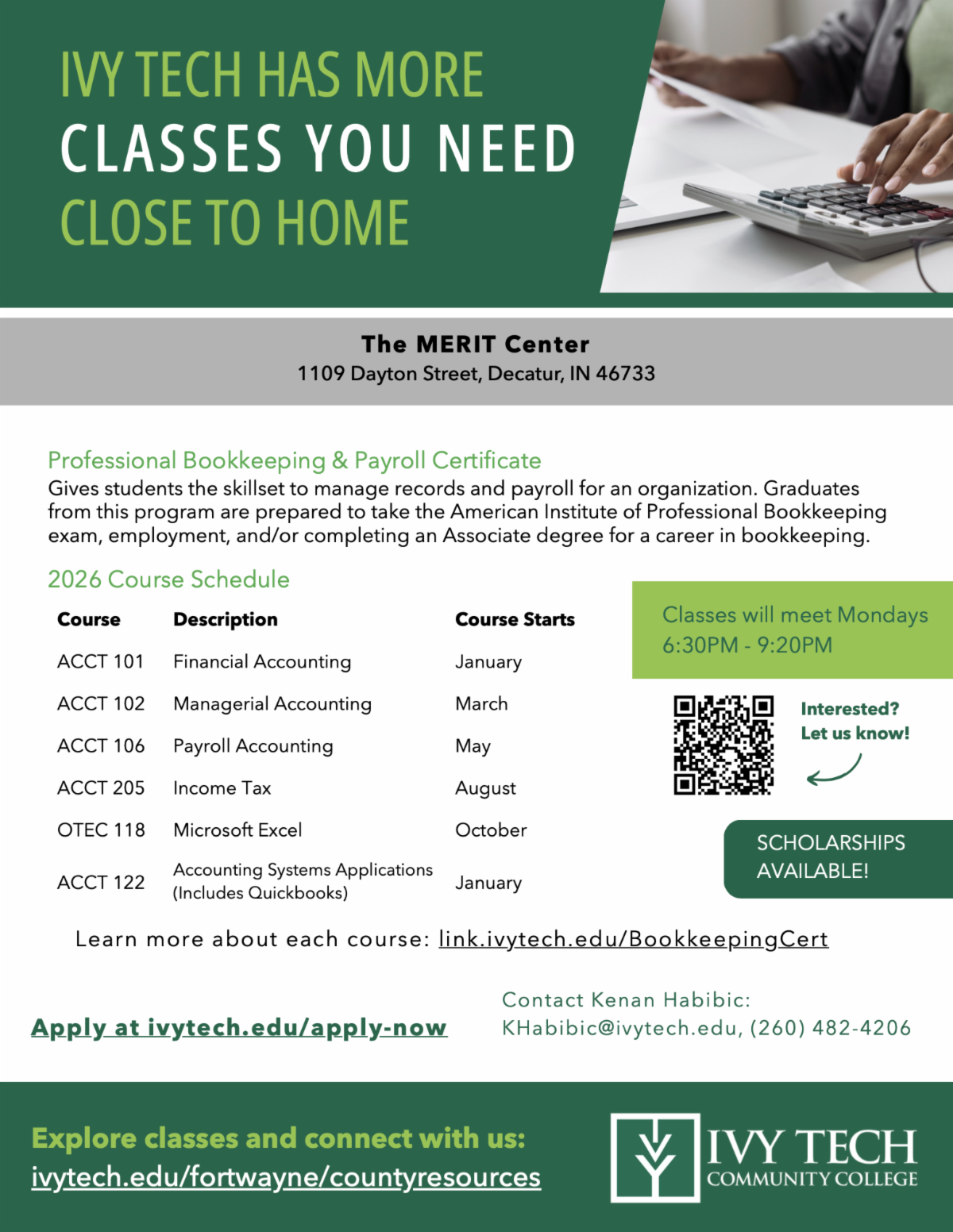 Ivy Tech Provides Valuable 2026 Course Offerings Close to Home in Areas of Bookkeepping, Payroll