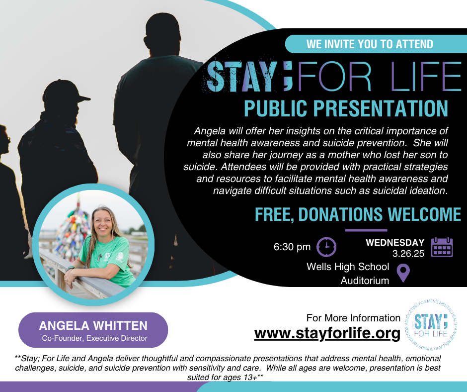 Join Stay; For Life at the Wells High School Auditorium on Wednesday, March 26th, 2025 at 6:30 PM, where Angela will offer her insights on the critical importance of mental health awareness and suicide prevention. She will also share her journey as a mother who lost her son to suicide.