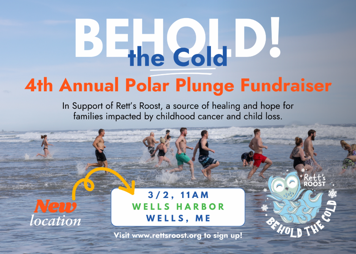 The 4th Annual Behold the Cold Polar Plunge in support of Rett’s Roost is coming to Wells Harbor on Sunday, March 2, at 11 AM! Participants will take the plunge to support Rett’s Roost’s mission to be a source of hope and healing for families impacted by childhood cancer and child loss. The group plunge is set for 11:30 AM, with a weather contingency date of March 9 at 10 AM. While the Town of Wells is not hosting this event, residents should be aware of increased activity in the area. Those interested in participating can find more information and register below.