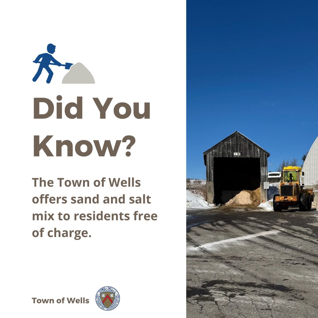 With the recent storms, we want to remind Wells residents that salt and sand mix is available at the Public Works Facility, located at 577 North Berwick Rd, Wells, ME. The mix is located in the shed adjacent to the salt building.
