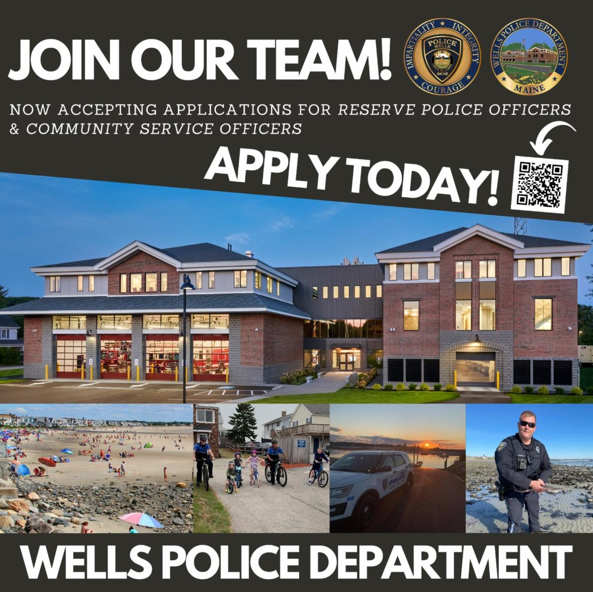 - The Town of Wells is now accepting applications for the positions of Summer Reserve Police Officers & Community Service Officers (CSO), for the 2025 season. The police positions include bike, foot, or cruiser patrol. Officers are required to work various shifts including nights, weekends and holidays. The community service officers will support police operations and work in the beach areas assisting citizens with parking and other duties to include town ordinance enforcement.