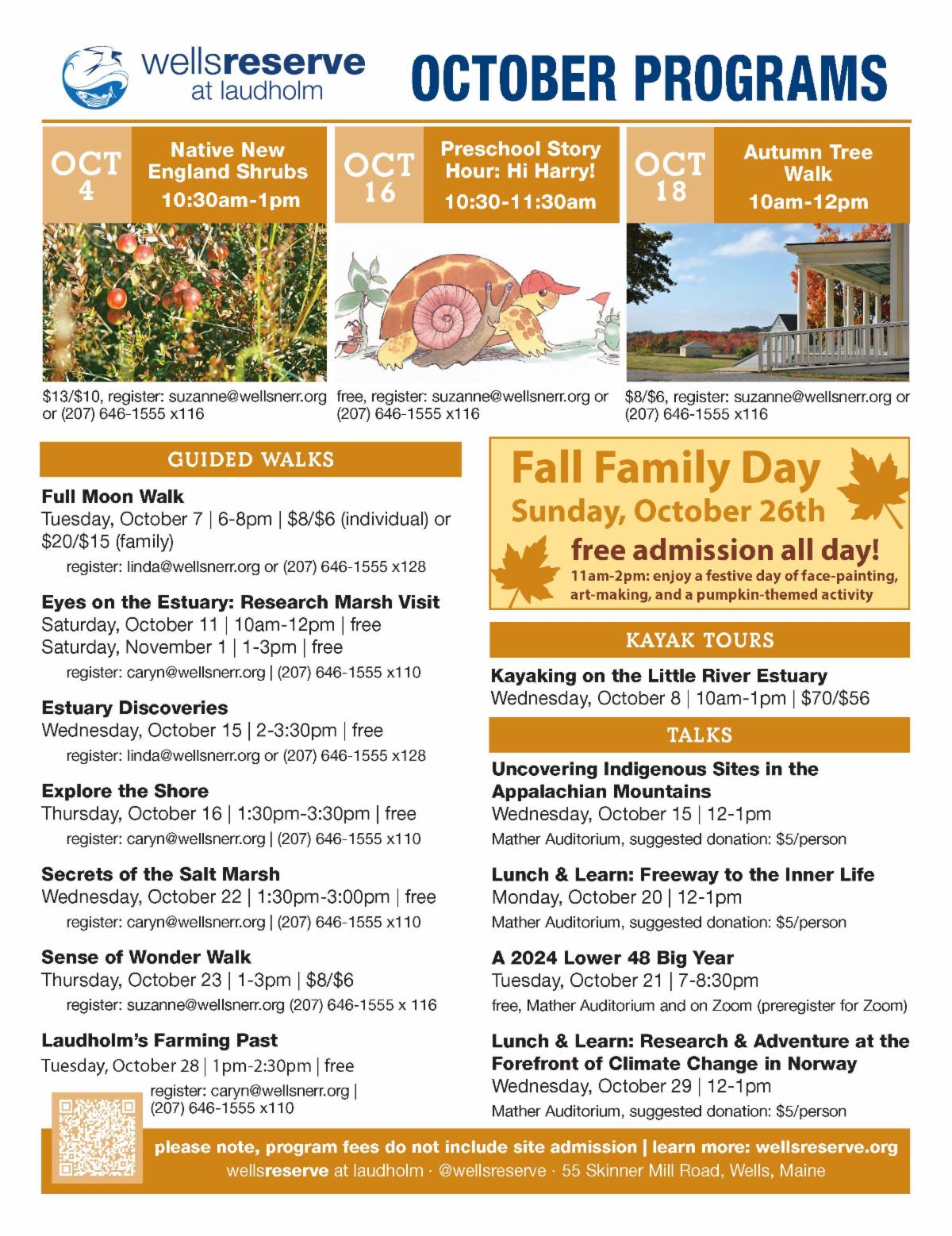 Celebrate fall with free admission to the Wells Reserve at Laudholm! Enjoy face-painting, art-making, and pumpkin fun—a festive day for all ages and abilities. Come explore the Reserve in all its fall splendor! No reservations required. Learn more at wellsreserve.org/calendar.