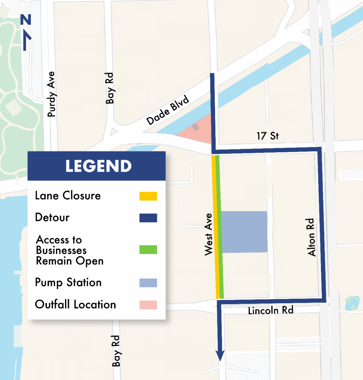 Drivers traveling south on West Avenue, wishing to continue south, can use Alton Road as an alternative. Drivers traveling along Dade Boulevard or 17 Street that wish to turn south to West Ave will be directed to use Alton Road to travel around the work. Alton Court will remain open to northbound-only traffic.
