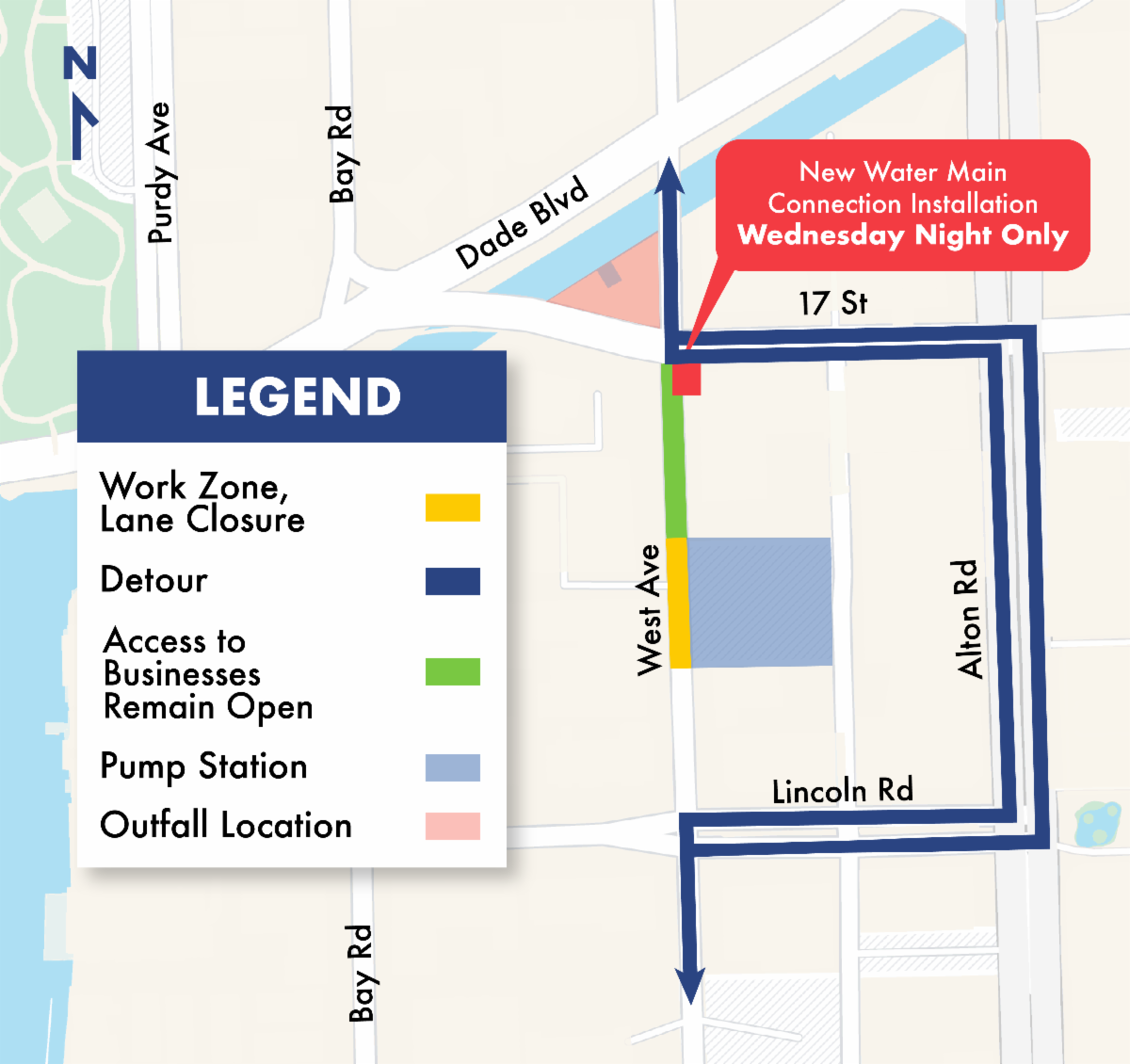 West Avenue in both directions will remain closed in front of the pump station site. Drivers and bicyclists will continue to be directed to use Alton Road.