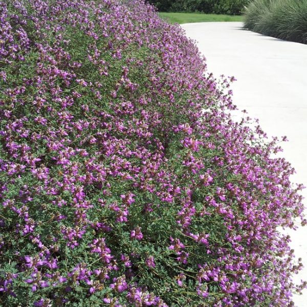 Deciduous; nearly evergreen, with silver fernlike leaves. Purple or pink blooms appear intermittently from spring through fall. Dalea is a low mounding shrub, resembling lavender, lantana, or a small Texas sage; it makes a great groundcover for rocky areas with rocky soil or extreme heat. Use it around strongly formed plants like agaves. Dalea is fairly easy to establish, but provide good drainage, avoid fertilizer, and don’t overwater (especially in winter).