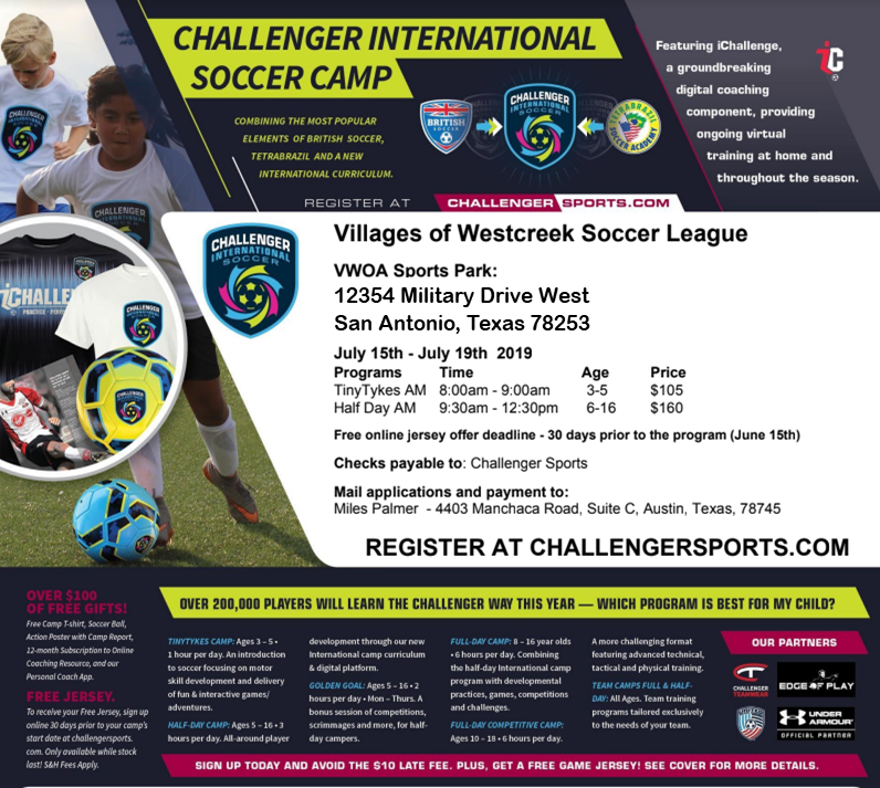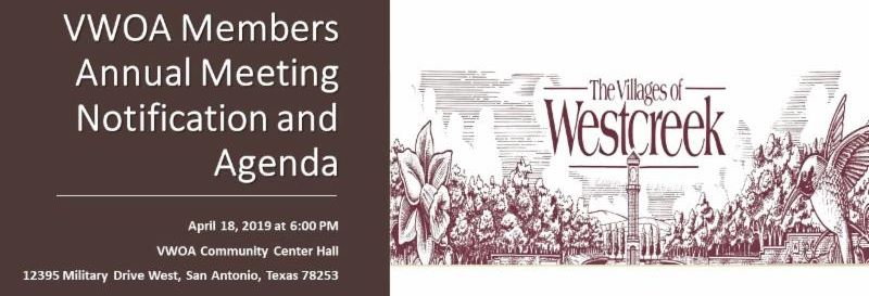The Villages of Westcreek Owners' Association will hold their Annual Meeting on April 18, 2019, at 6:00 PM in the Community Center Hall located at 12395 Military Drive West, San Antonio, Texas 78253.