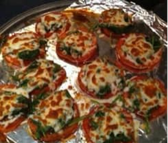 - Meanwhile, sauté spinach and garlic with a dash of salt and lemon juice. Put spinach on top of tomatoes and sprinkle with cheese of your choice (I chose Italian blend) and broil until cheese is golden!