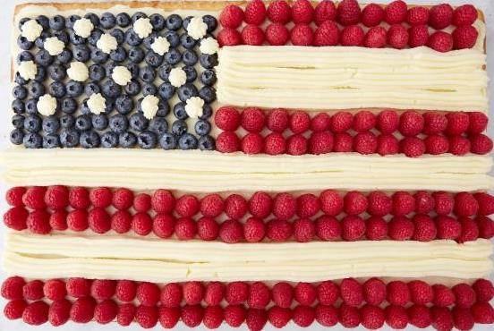 Spread three-fourths of the icing on the top of the cooled sheet cake. Outline the flag on the top of the cake with a toothpick. Fill the upper left corner with blueberries. Place 2 rows of raspberries across the top of the cake like a red stripe. Put the remaining icing in a pastry bag fitted with a star tip and pipe two rows of white stripes below the raspberries. Alternate rows of raspberries and icing until the flag is completed. Pipe stars on top of the blueberries.