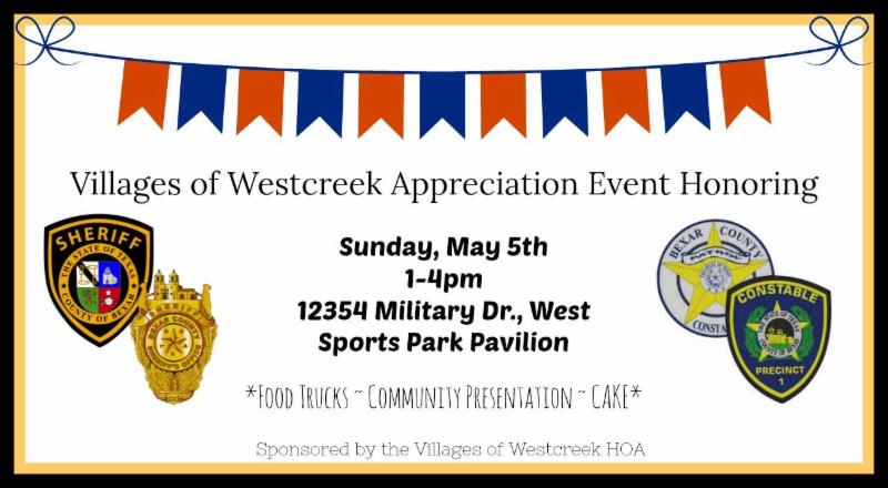 Drop by the VWOA Office during normal business hours and sign your personal Appreciation Cards as part of our VWOA Appreciation Event for our Deputies from the Constable's Office, Bexar County Sheriffs Office, and VWOA Patrol Officers.