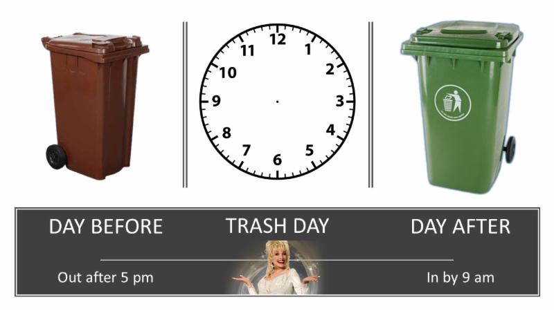 Trash and recyclable containers and any other refuse for trash pickup are to be placed in the street next to the curb and may not be put out earlier than 5:00 PM the day before the scheduled collection day and are to be stored out of sight from the street by 9:00 AM the following day.