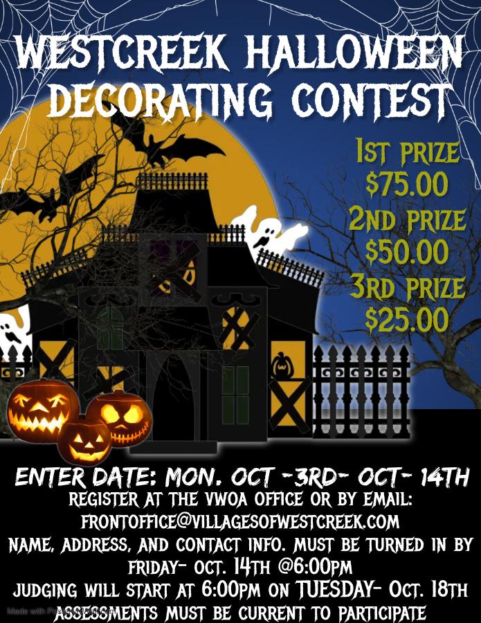 To enter the HALLOWEEN DECORATING CONTEST" you can register at the VWOA Office or by sending an email to: FrontOffice@villagesofWestcreek.com.
