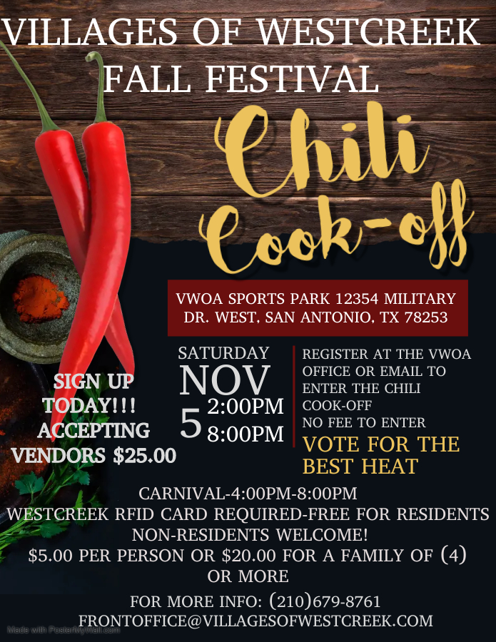 To enter the "CHILI COOK-OFF CONTEST" you can register at the VWOA Office or by sending an email to: FrontOffice@villagesofwestcreek.com.