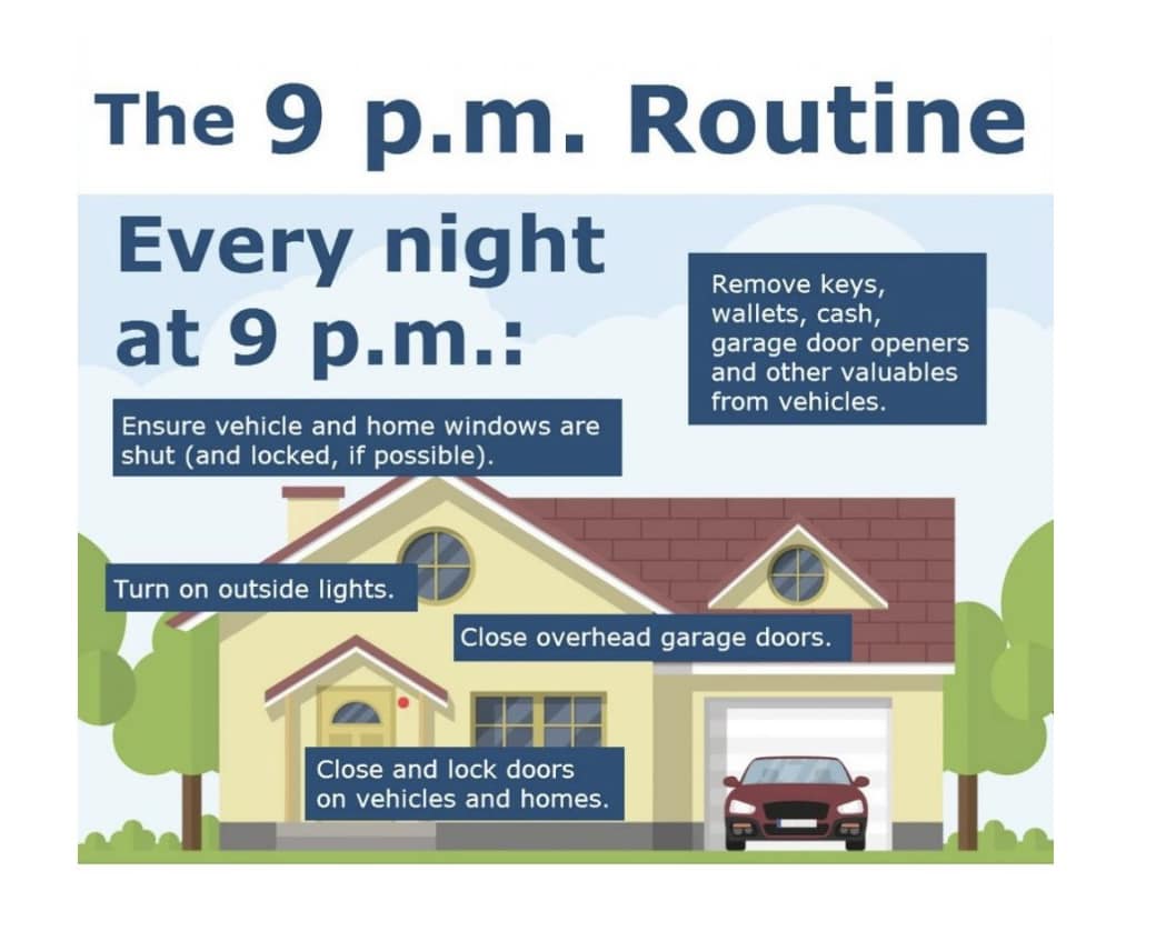The HOA Board is doing what we can; however, it takes all of us to help lower crimes of opportunity; essentially, it is your job to protect your property. In the coming months, we will be publishing newsletter articles that bring you the statistics and additional information on how to protect your property, until then adopt the 9 p.m. Routine and let’s start making it harder for the criminals to get the things we work so hard for!