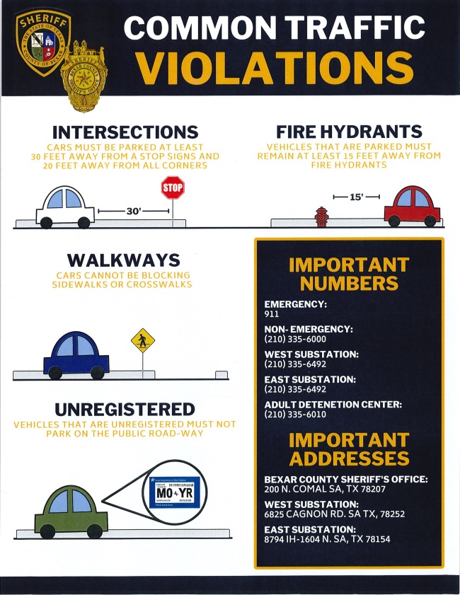 Two of these agencies are the Environmental Agency & Code Compliance which deal with code compliance issues, such as illegal dumping, abandoned and leaking vehicles, overgrown lawns and sidewalks, and areas that would promote bugs, mice, and rats to propagate, amongst other things. If one of these items applies to your home, please get it taken care of immediately before you receive a citation from the county. They have begun their patrols and will be issuing citations on-site. If you live near an area of concern, please email standards@villagesofwestcreek.com with the address and details so we can forward that information to the county for further investigation. You may also report them directly to Code Compliance by calling 210-335-6664