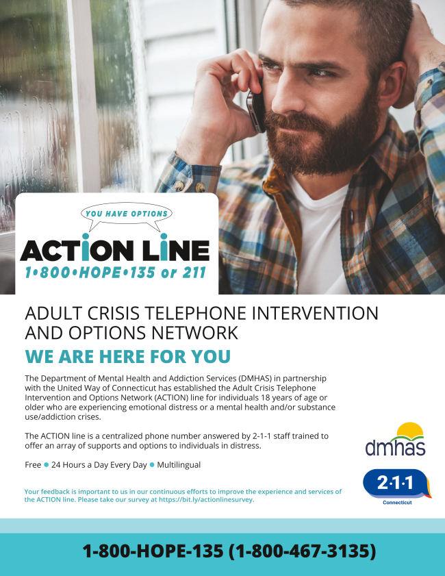 Adult Crisis Telephone Intervention and Options Network (ACTION) line for adults 18 and over who are experiencing a mental health crisis or emotional crisis for which an immediate response may be required. The ACTION line is a centralized phone number answered by 2-1-1 staff trained to offer an array of supports and options to individuals in distress, including telephonic support; referrals and information about community resources and services; warm-transfer to the Mobile Crisis Team (MCT) of their area; and, when necessary, direct connection to 911. Read full press release here