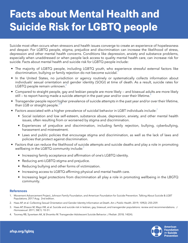 Survey data suggest that individuals who identify as LGBT are at greater risk for suicide attempts. AFSP has resources dedicated to raising awareness around the mental health concerns and suicide risk in this population.