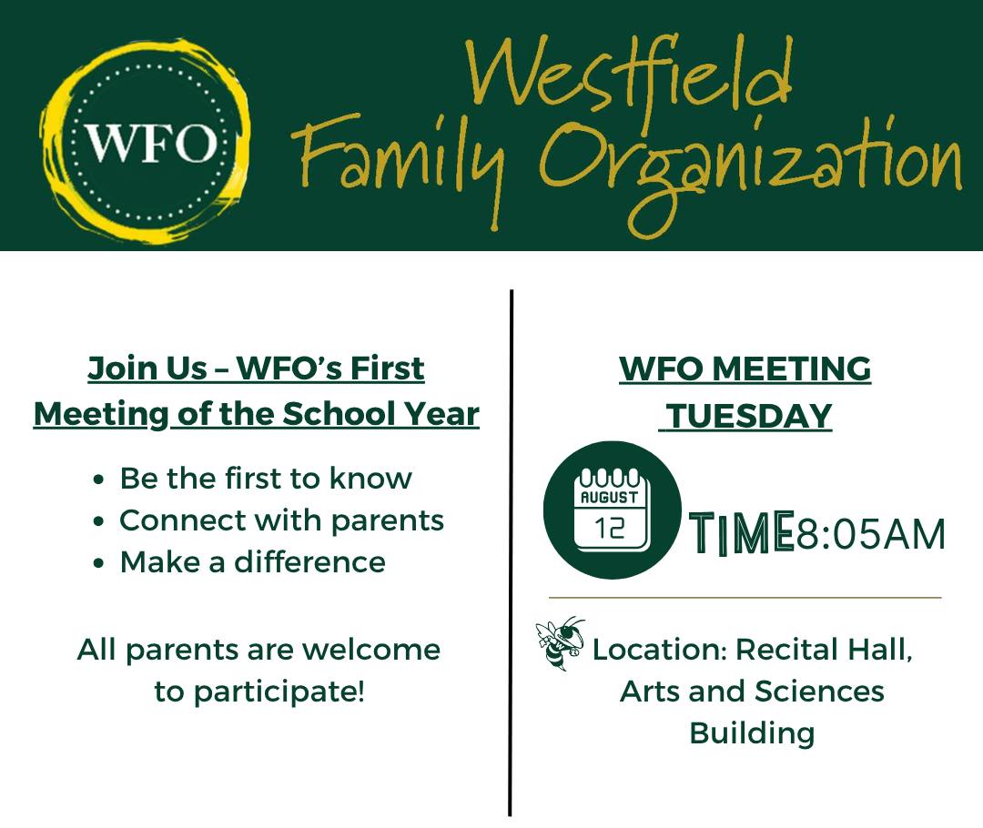 All families NEW to Westfield for the 2025-2026 school year are invited to stop by the Westfield Gymnatorium for a tailgate supper sponsored by the Westfield Family Organization (WFO) before our first home varsity football game.