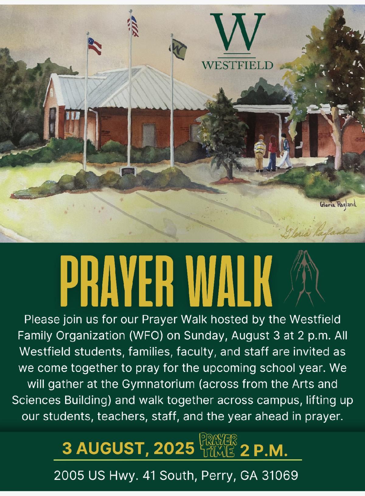 Parents and students are invited to meet in the Gymnatorium for prayer and a walk-through campus to pray for the coming school year. Sponsored by the Westfield Family Organization (WFO).