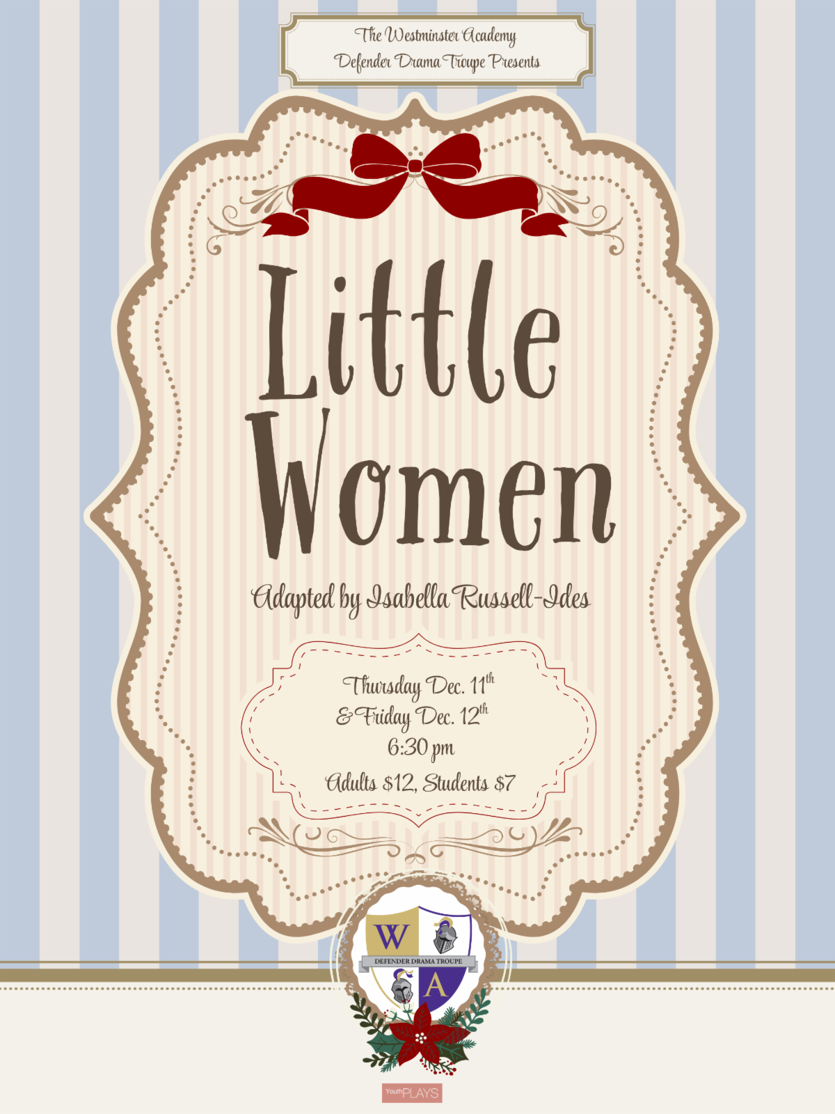 The Defender Drama Troupe will be staging Louisa May Alcott's Little Women, adapted by Isabella Russel-Ides, on Thursday, December 11, and Friday, December 12, at 6:30pm, in the RBC Youth Room of the CLC. Tickets may be purchased at the door via FACTS, cash, or check. Cost is $12 for adults and $7 for students and senior citizens.