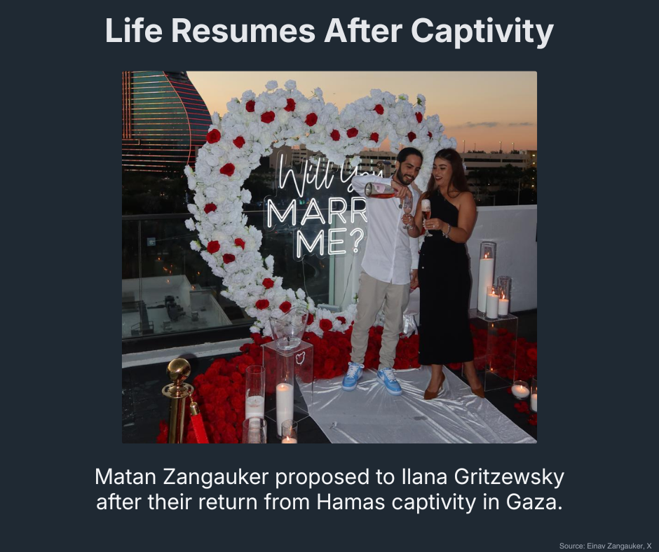The return of the remaining living hostages – and the remains of the deceased, except for one – allowed families to start healing and rebuilding after two years in brutal captivity. Former hostages have begun reclaiming their lives – including the ordinary milestones they had missed in captivity. Matan Zangauker recently proposed to Ilana Gritzewsky – they both were kidnapped by terrorists from Kibbutz Nir Oz. Zangauker’s mother tweeted a picture celebrating, calling it: “My picture of victory.”
