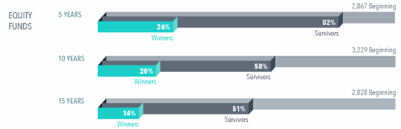 Each fund is evaluated relative to the Morningstar category index assigned to the fund’s category at the start of the evaluation period. So, if, for example, a fund changes from Large Value to Large Growth during the evaluation period, then its return will still be compared to the Large Value category index. Surviving funds are those with return observations for every month of the sample period. Winner funds are those that survived and whose cumulative net return over the period exceeded that of their respective Morningstar category index. Loser funds are funds that did not survive the period or whose cumulative net return did not exceed their respective Morningstar category index.
