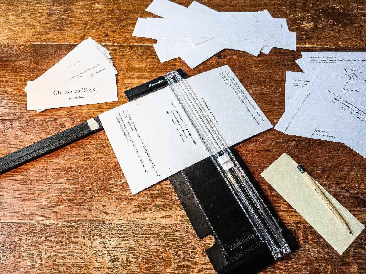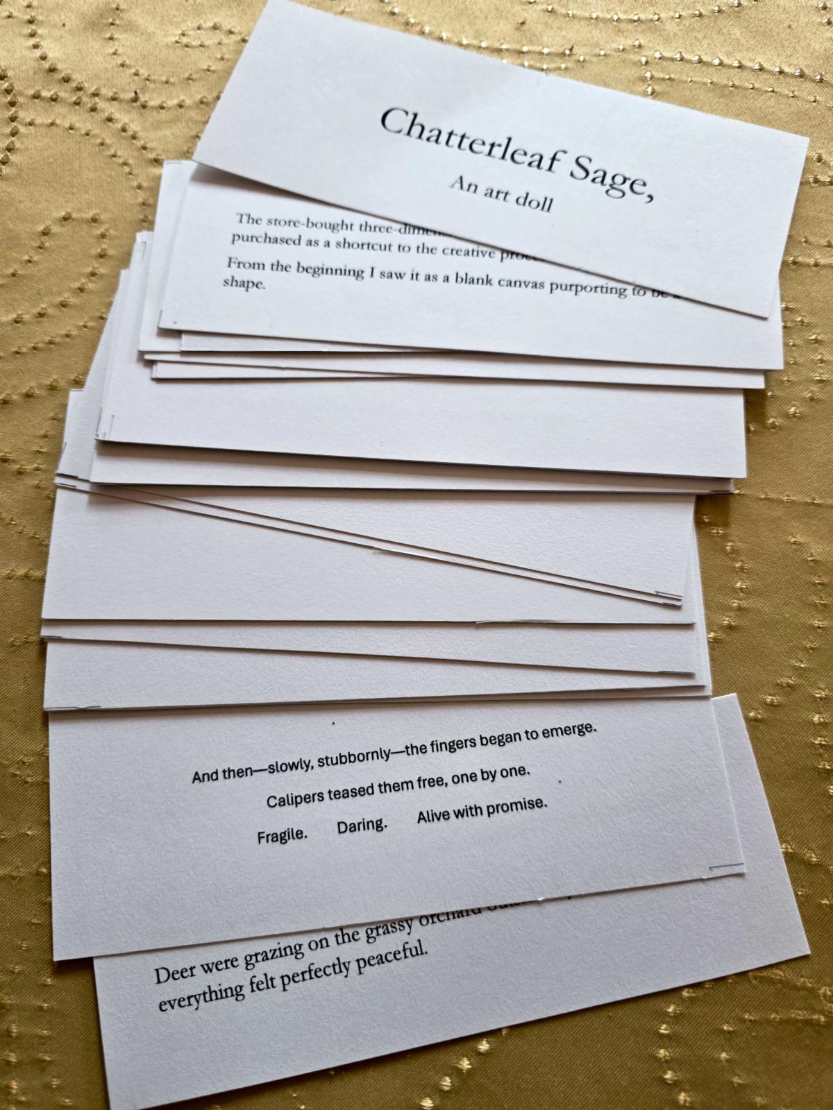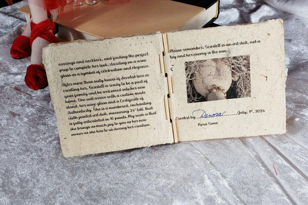 It should come as no surprise that a few art dolls ago, I reasoned that the certificate of authenticity and a book could dance together; a storybook made about an art doll that could serve as the doll’s certificate of authenticity. The surface choices and binding techniques could echo the doll’s personality. A woodland Meday, such as Chatterleaf Sage might deserve a Coptic bound book with exposed threads mimicking vine growth. Narrative and certificate could merge, lifting authentication into art of itself, rather than paperwork tucked in a drawer.
