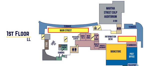 Stop by to talk nerdy with CTE staff about any teaching issues, big or small, during our CTE Casual Chat times. From September through November, you’ll find us in the Culp Center on designated days, at a table either on “Main Street” or in front of Starbucks (see red outlined areas below); we'll also be near Einstein's Bagels in Sherrod Library one morning per week. We’ll put up a table sign so you can find us!